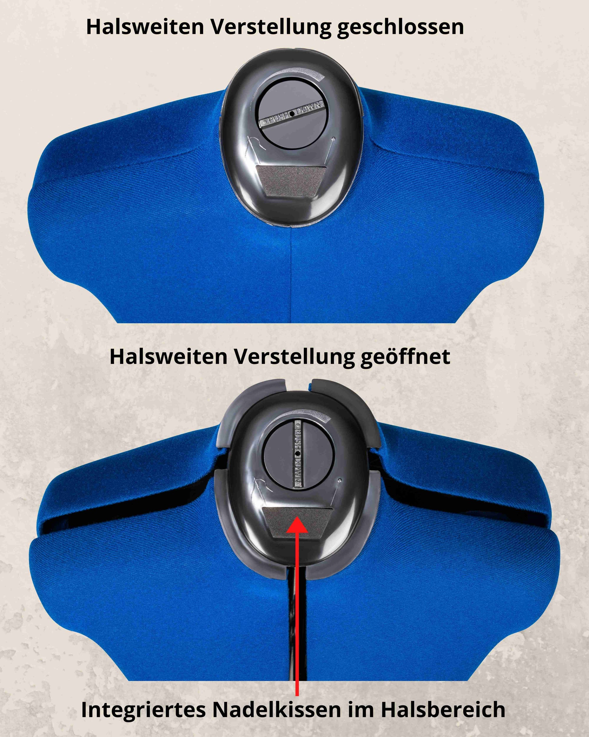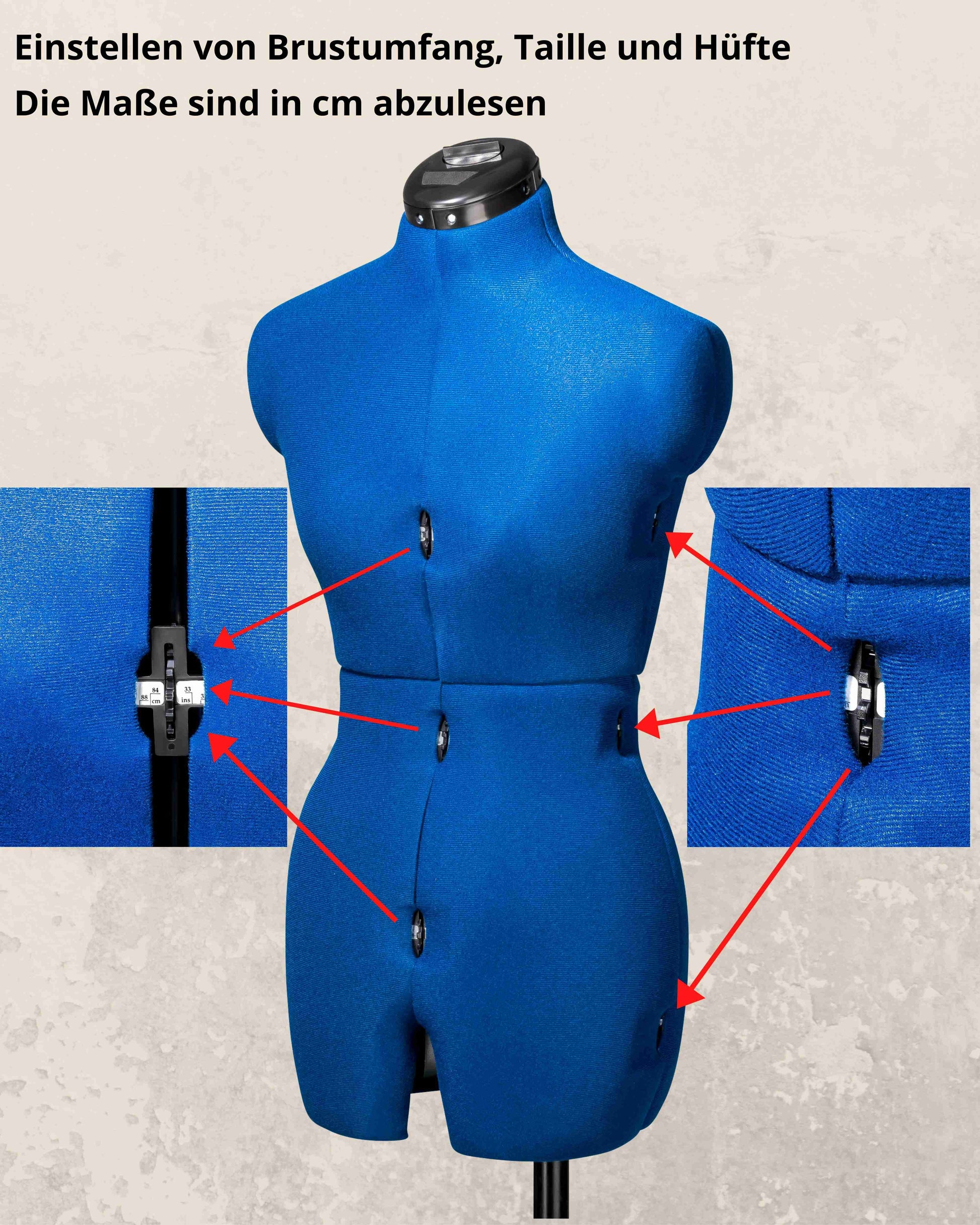 Mit 14 individuellen Verstellfunktionen lässt sich jede Körperform realistisch nachbilden. 12 Stellrädchen ermöglichen exakte Anpassungen an Brust, Taille und Hüfte, ergänzt durch Regler für Rückenlänge und Halsumfang.